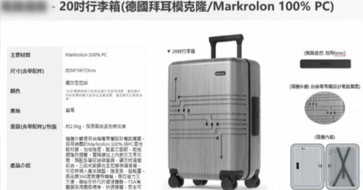 網路賣場搜尋台積電行李箱,一整排全是這款,外觀充滿科技感的銀色箱體,搭配金屬紋理,箱身還印有專屬電路板圖樣,右上角則點綴著精緻小巧的「TSMC」標誌,質感與辨識度兼具,實體細節滿滿,原來這款20吋行李箱,是台積電福委會送的員工禮品之一,與知名品牌萬國通路合作。