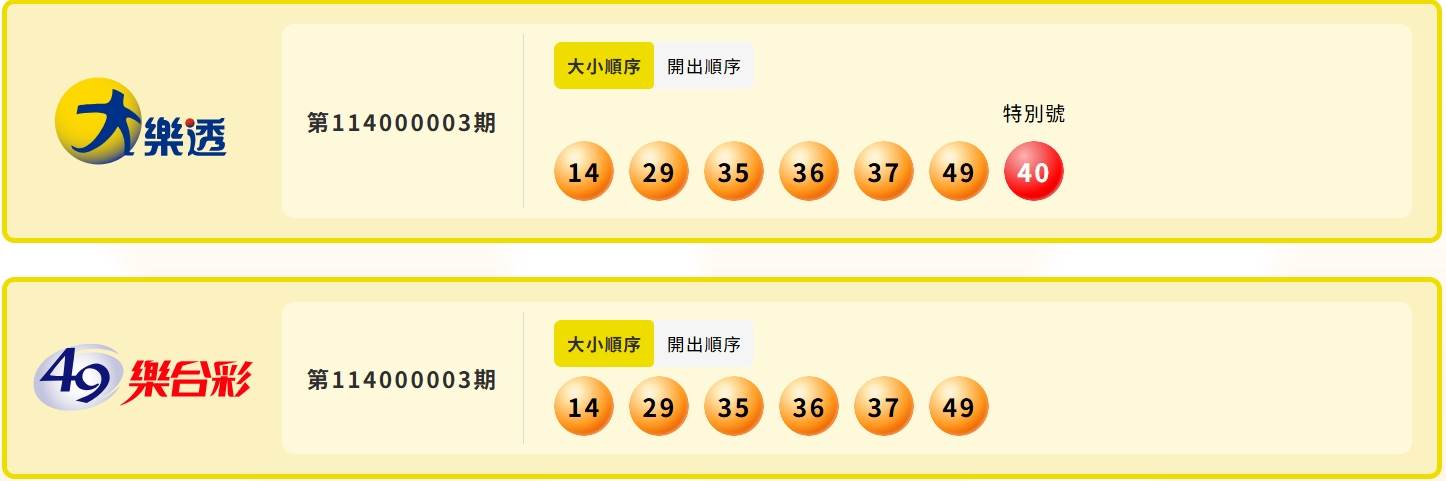 大樂透的中獎號碼為「14、29、35、36、37、49」特別號為「40」。