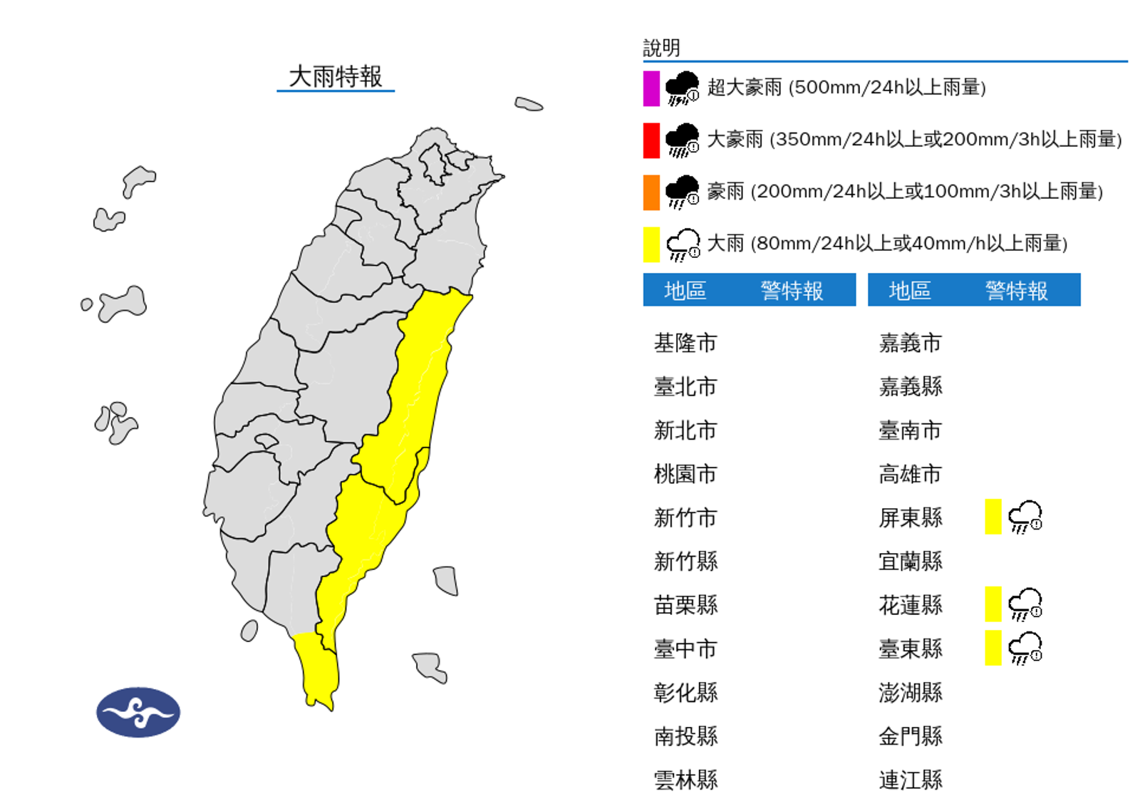 颱風外圍環流影響,易有短延時強降雨,今(5日)花蓮、台東地區及恆春半島有局部大雨發生的機率,請注意雷擊及強陣風。(中央氣象署提供)