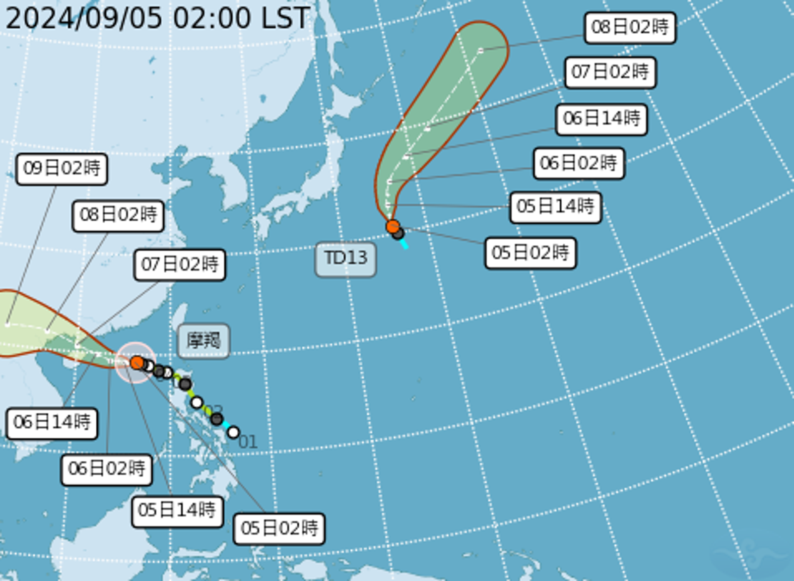 目前太平洋地區有中度颱風摩羯,以及1個熱帶性低氣壓TD13。(中央氣象署提供)